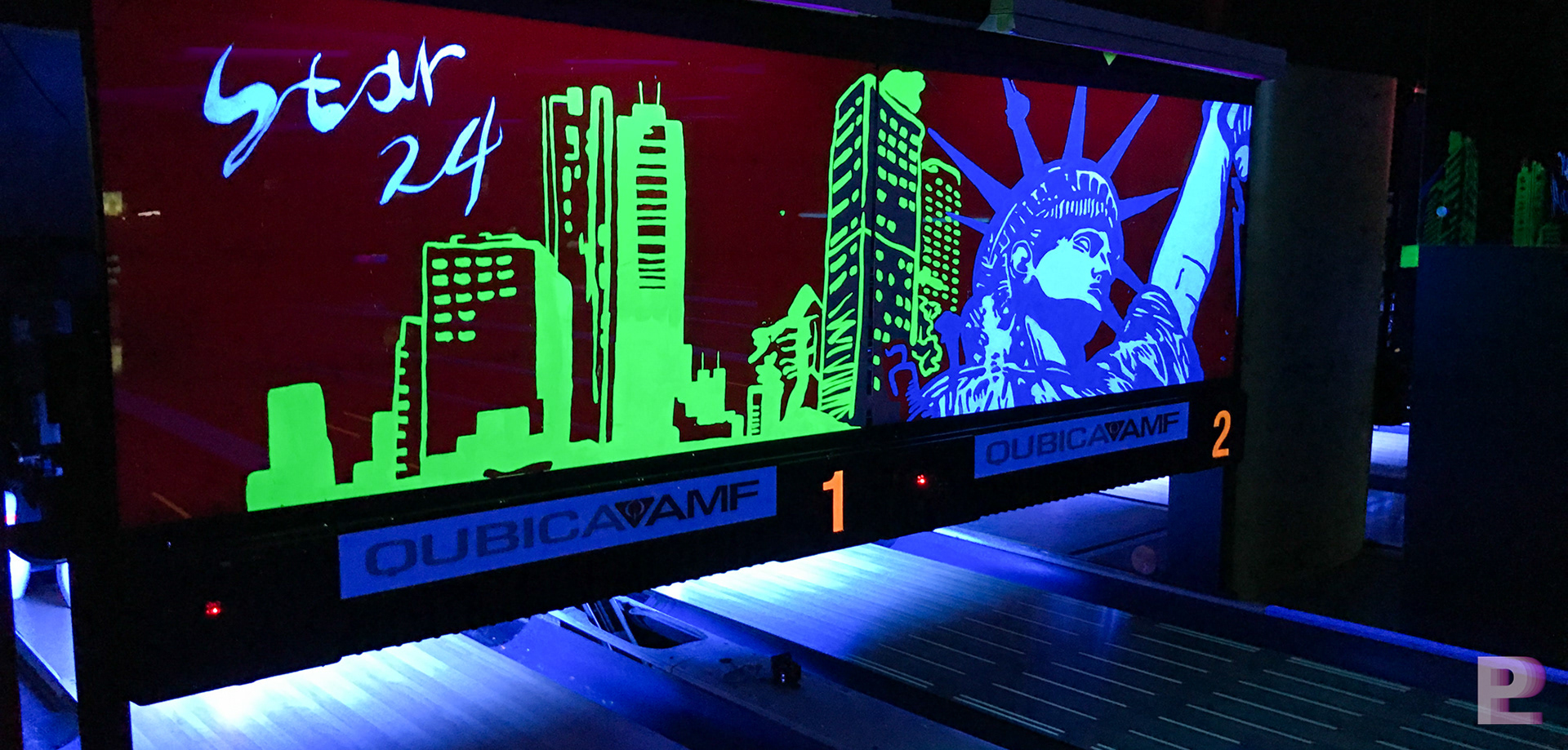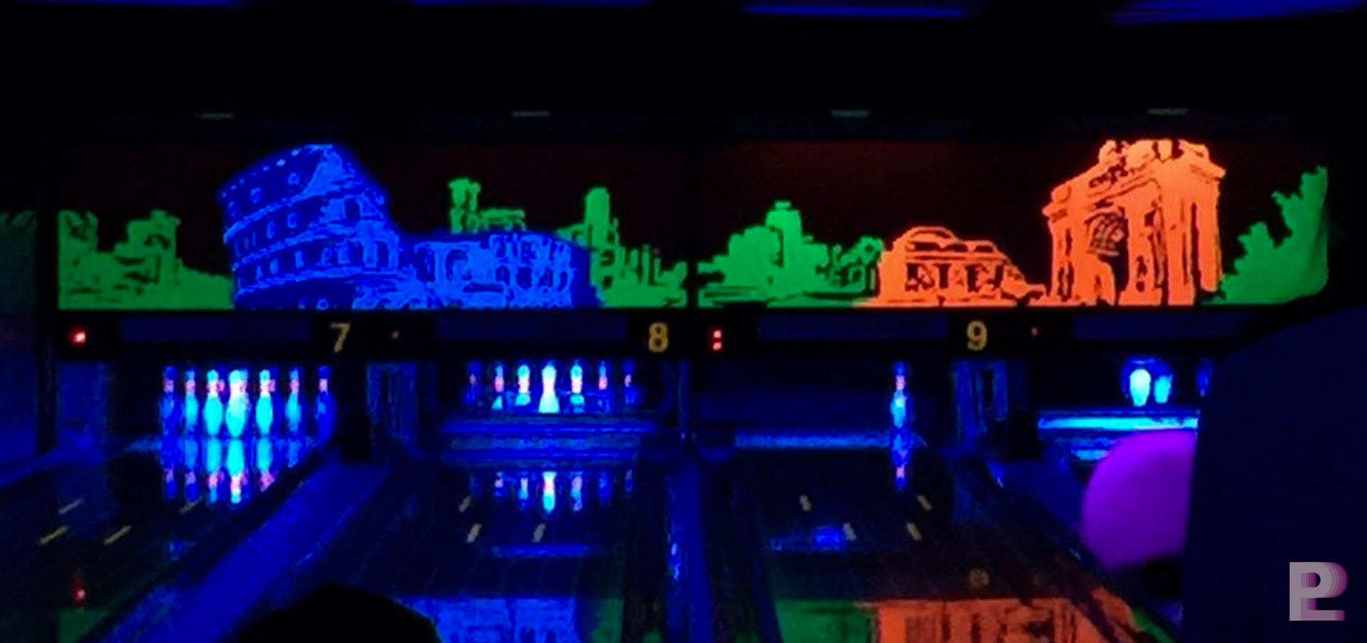 서울 강남에 위치한 강남 스타24시 볼링장에는 "세계여행"의 컨셉으로 디자인 & 벽화시공이 진행되었습니다. 락볼링장이 유행하면서 블루라이트에 반응하여 발광하는 형광(루미나이트)벽화가 많은 사랑을 받았습니다.