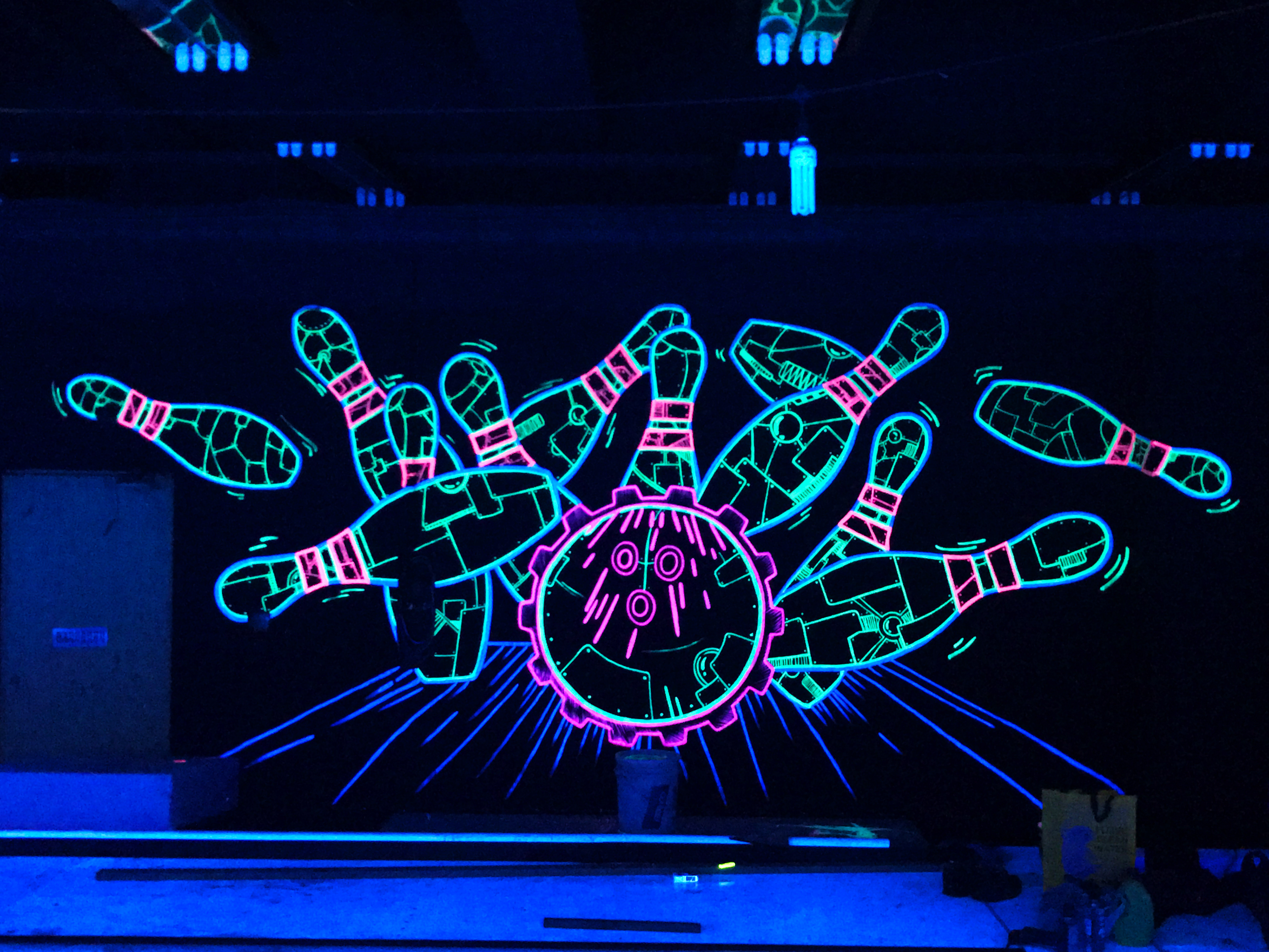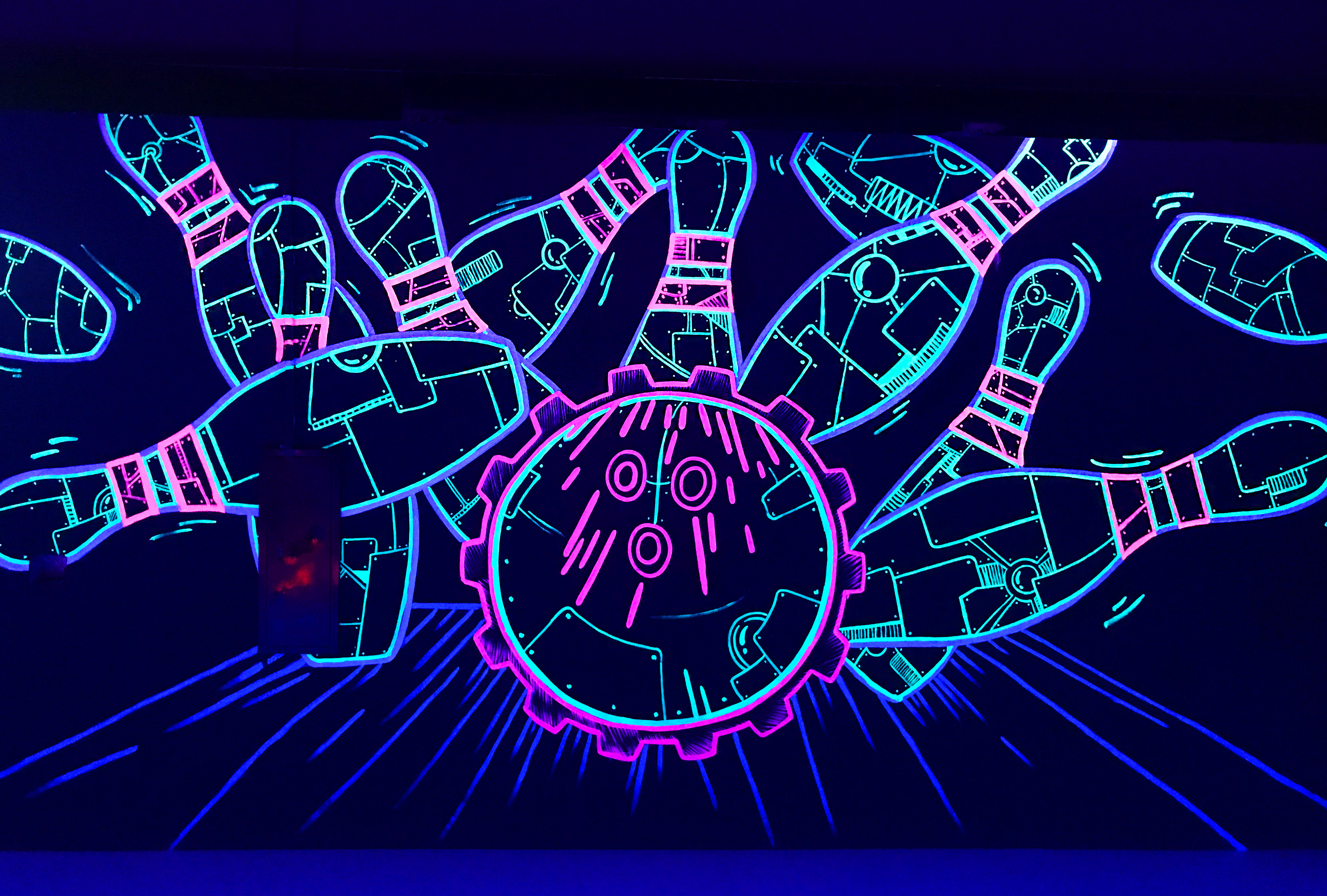 서울 고척동에 위치한 길거리 돔 볼링장에는 많은 종류의 벽화가 시공되었습니다. 그 벽화들 중 메인 벽면에 포토존의 형태로 제작된 형광벽화로서 스트라이크가 되는 순간을 역동적이게 표현하는 것을 목표로 디자인이 진행되었습니다.