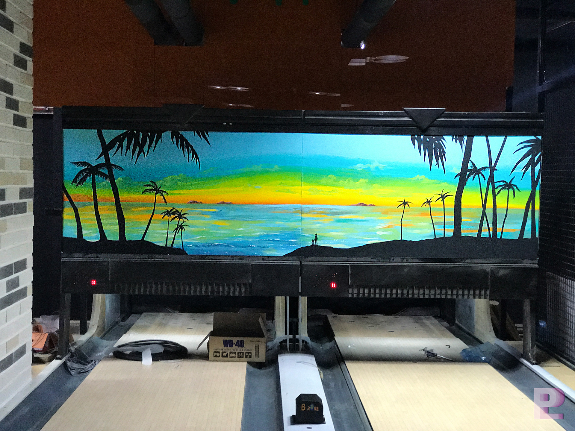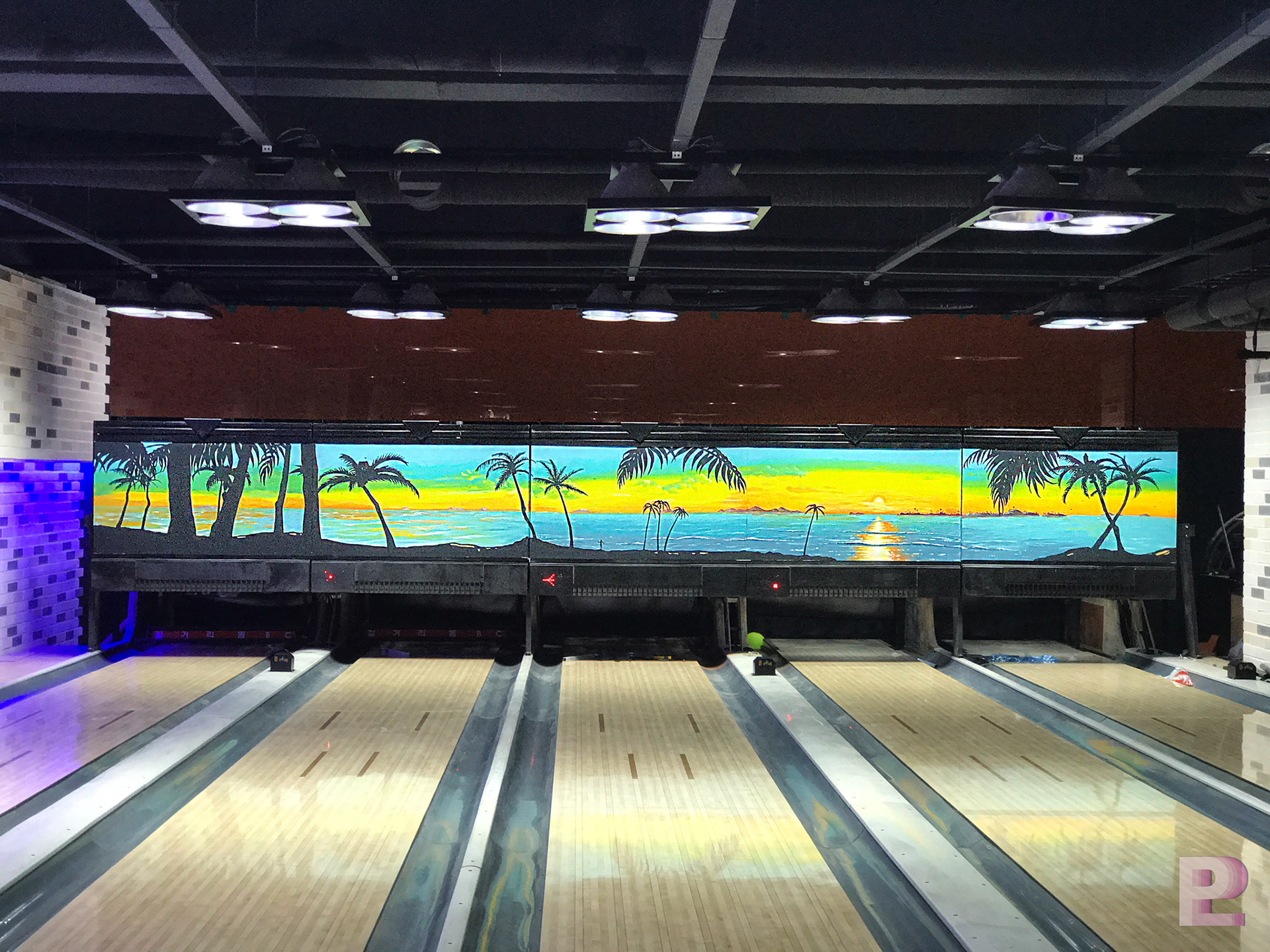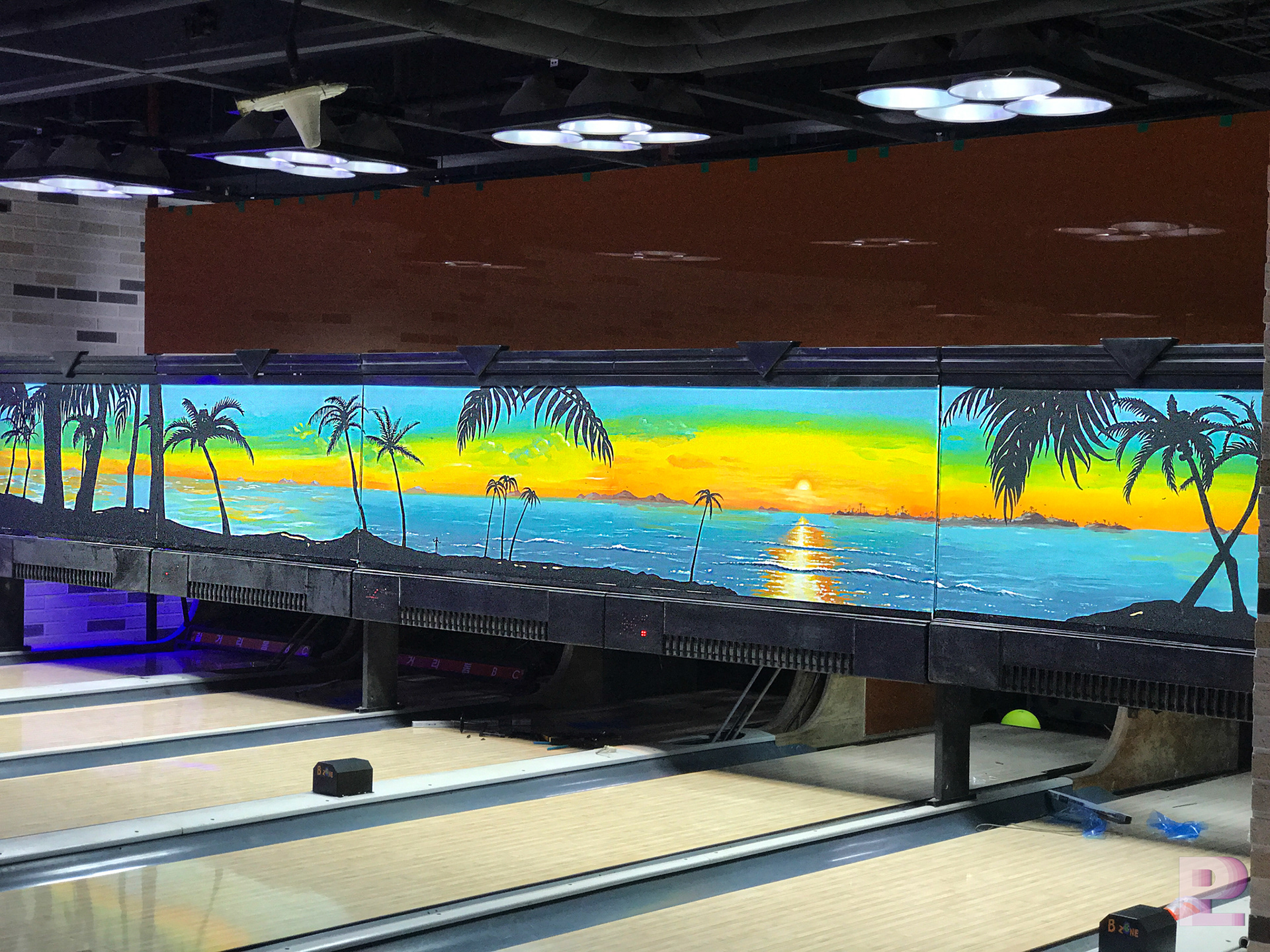 길거리 돔 볼링장 1층은 트로피카 해변의 풍경을 일러스트기법으로 디자인 & 시공되었습니다.