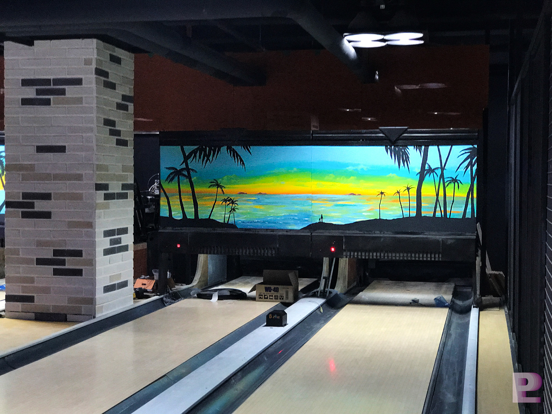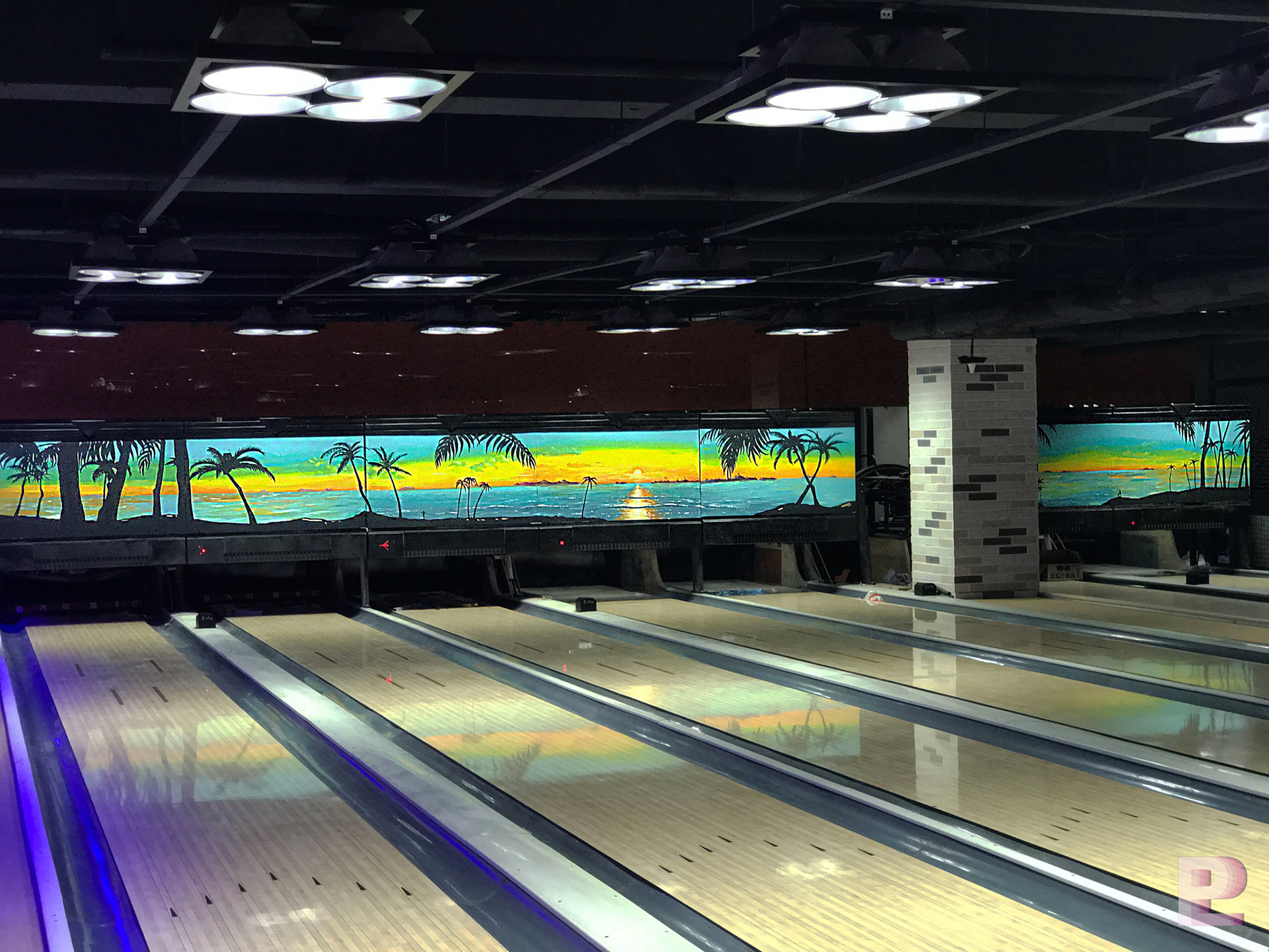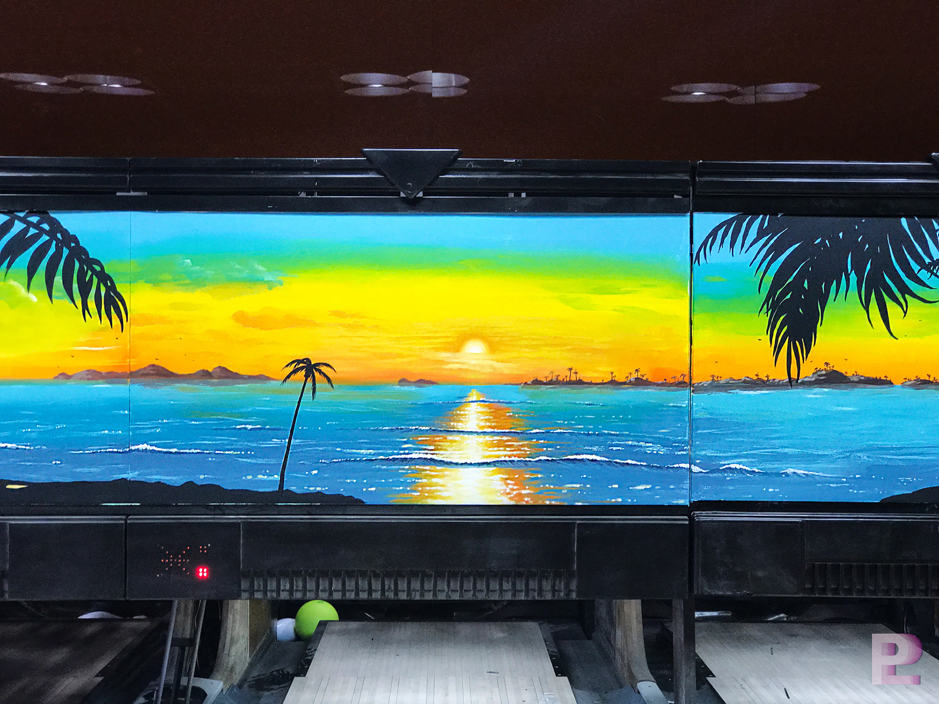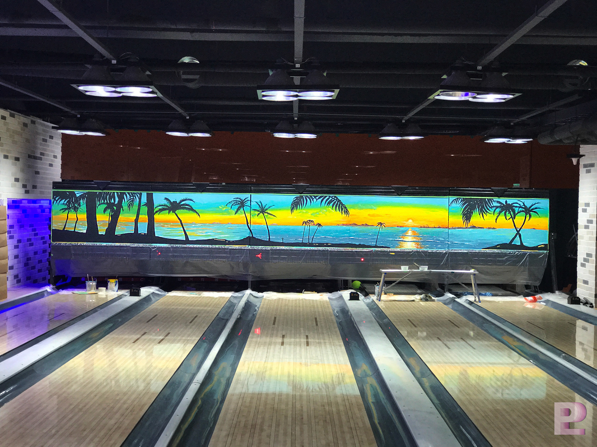 길거리 돔 볼링장 1층은 트로피카 해변의 풍경을 일러스트기법으로 디자인 & 시공되었습니다.