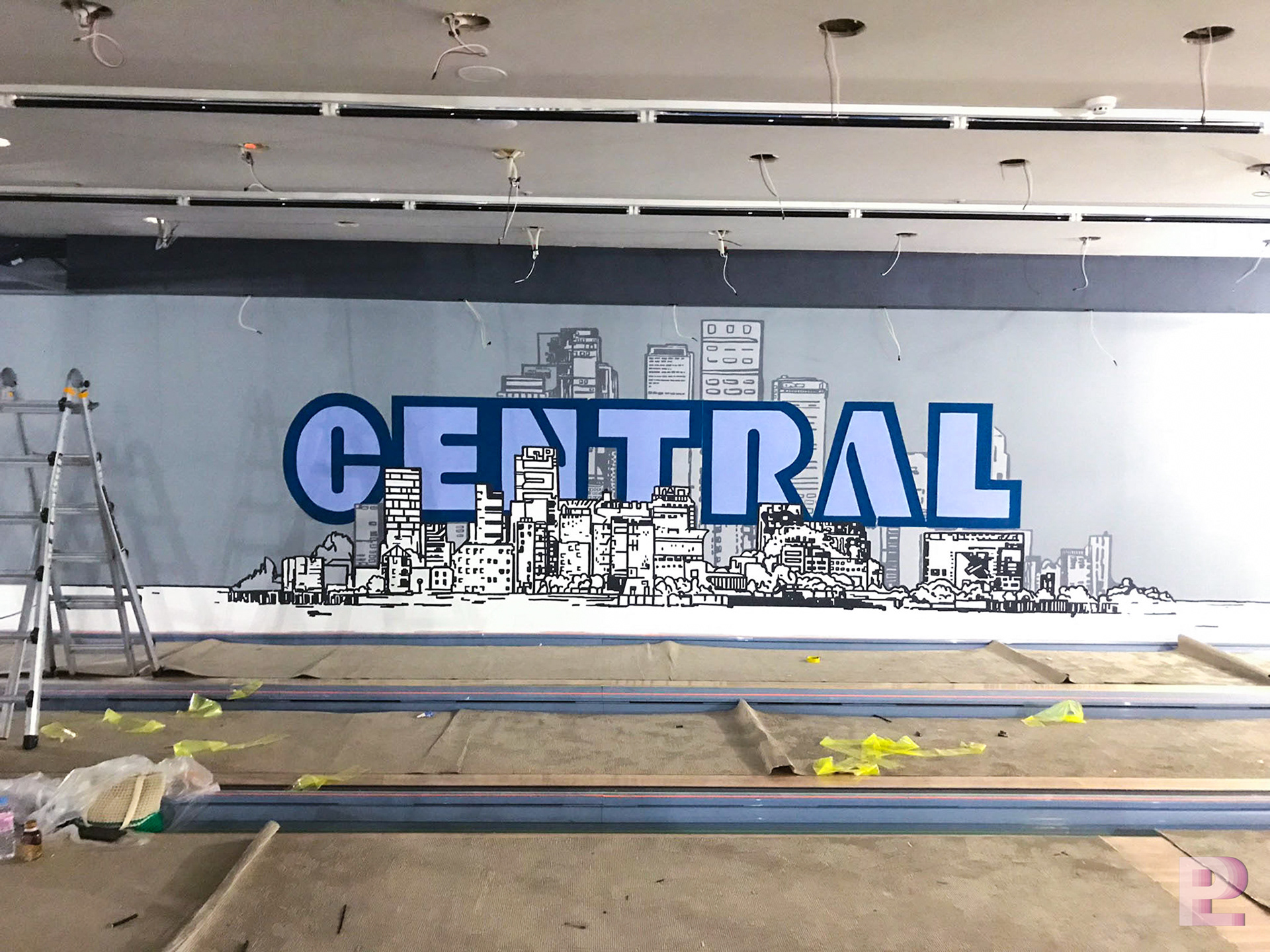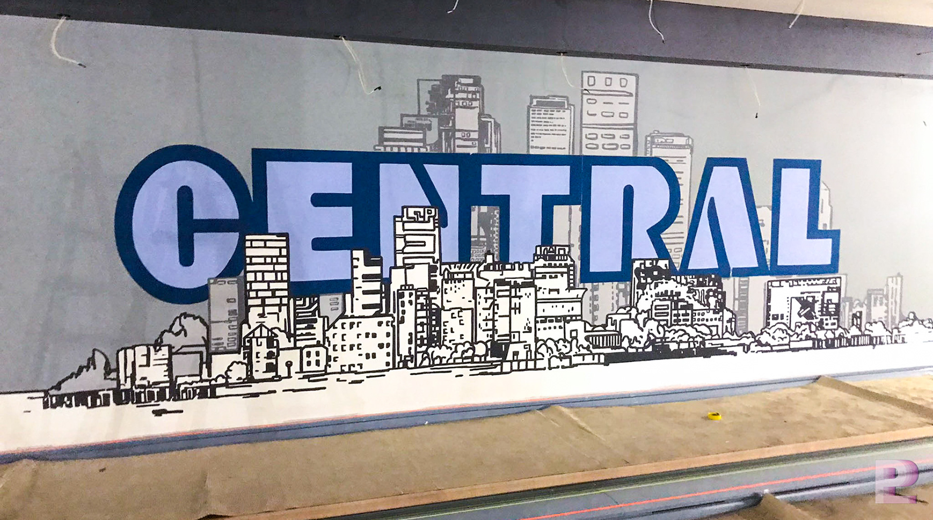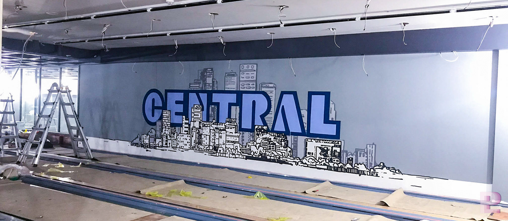 경기도 산본에 위치한 센트럴 볼링장의 레일 좌측에 포인트가 되는 인테리어 벽화를 디자인 & 시공을 진행하였습니다. 도시 배경을 2개의 레이어로 나누어 라인드로잉 기법으로 디자인하고 2개의 레이어 사이에 CENTRAL 상호명을 배치하여 벽화에 입체감이 느껴질 수 있도록 제작되었습니다.